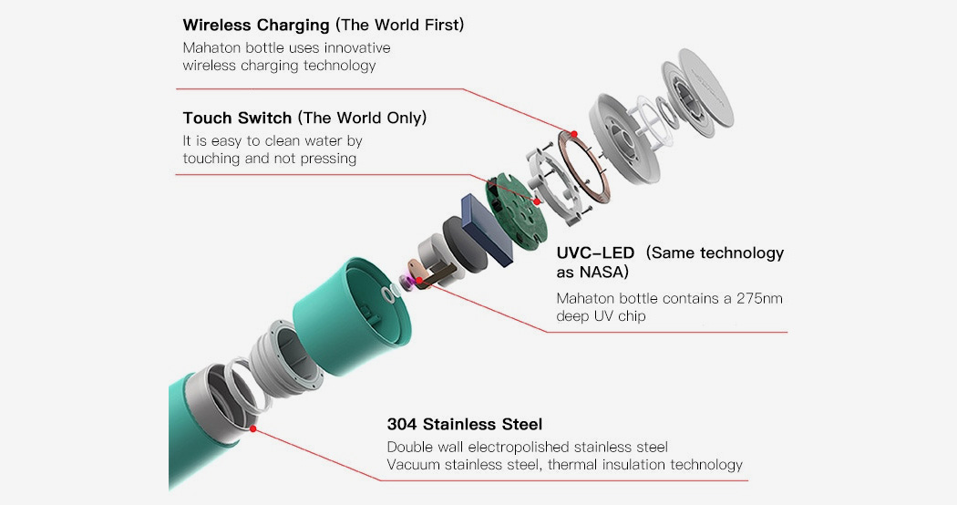 瓶蓋內(nèi)裝有紫外線LED殺菌裝置,照射進(jìn)瓶中,反射到瓶口的金屬表面,殺死水中的任何微生物,并去除任何臭味。先進(jìn)的275nm紫外線可以在90秒內(nèi)輕易殺死瓶子里的任何細(xì)菌,保證每次滅菌后水源都是純凈。水杯本身配備了獨(dú)特的無線充電底座,使水杯有效防水,也有助于你輕松地為Mahaton的紫外線裝置充電。