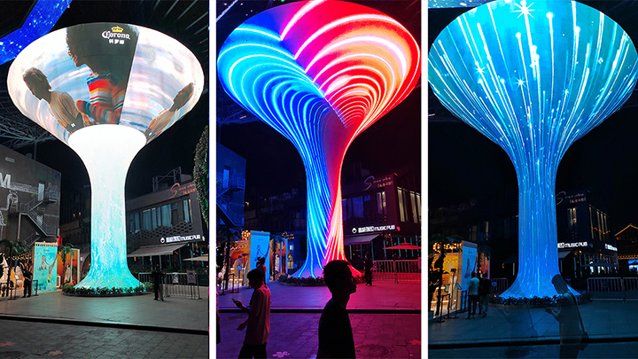 這塊異形LED顯示屏由上海智彩專(zhuān)案定制,高達(dá)12米,面積達(dá)113.4平方米。獨(dú)特的造型,絢麗的顯示效果,光與影交匯,聲與色齊聚,給人以非常震撼的感官體驗(yàn)。